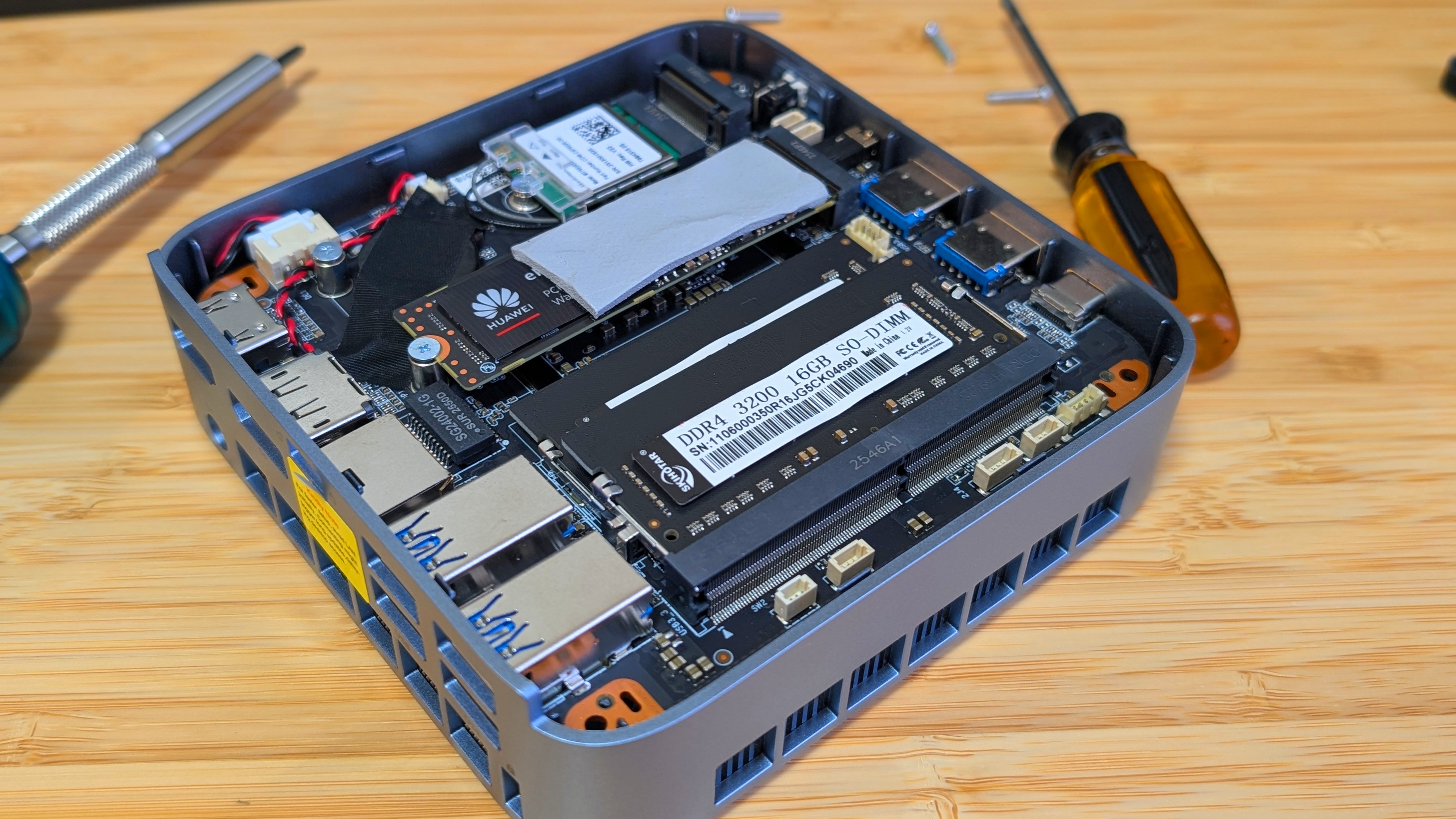 Where it gets a little odd is that you have to turn over the Mini PC, remove the glued-on rubber feet, and unscrew the tiny screws first. After that, you have to turn the M5 back upright before you can flip the switch on the back of the PC. But once you do that, you’re inside with access to two DDR4 So-DIMM slots, 2x 2280 slots, your CMOS battery, and a replaceable wifi card. Because of that, it’s one of the easier PC’s to access that I’ve covered in a while now.