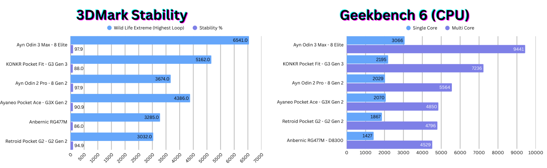 Taking a look at pure CPU performance, the Odin 3 runs away with it, scoring nearly 30% higher in single-core performance and nearly the same percentage higher than the G3 Gen 3 in multi-core. 3D Mark is where we want to see stability, though. Using the Wild Life Extreme stress test, the Odin 3 managed a high loop score of 6541, with a stability rating of 97.9%, which means over time, it’s going to handle its heat really well. The Odin 2 and Retroid Pocket G2 manage 95-98% stability ratings as well, but the disappointment comes from the others. AYANEO/Konkr both sit at 88-90%, while the Anbernic RG477M on GammaOS only manages 86%.